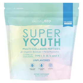 Super Youth Collagen by SkinnyFit includes 7 g of hydrolyzed collagen per serving, sourced from bovine, fish, chicken, and eggshell membrane. It also includes vitamin C, apple cider vinegar, and hyaluronic acid and is sweetened with stevia leaf and monk fruit extracts. Each container consists of 30 servings of unflavored collagen powder.